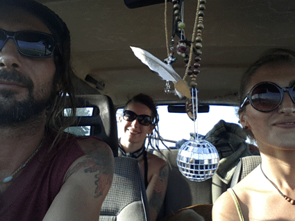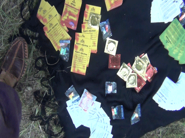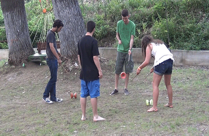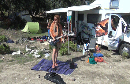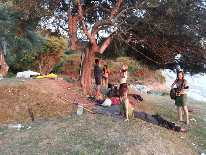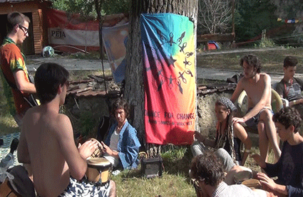 Gegen Nachmittag tragen wir wieder das Alice-Infomaterial, Jonglagesachen und Musikinstrumente auf den Campingplatz. Dort gibt es schon einige Leute am Musiksession machen. Wir treffen auch Leute aus Deutschland und aus Frankreich.