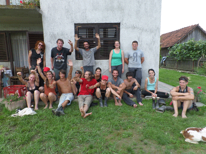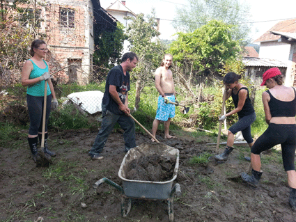 Wir arbeiten mit acht auswärtigen HelferInnen zusammen und schaffen es, drei Häuser/2 Gärten von Schlamm zu befreien. Mittagessen gereicht von den BewohnerInnen mit lecker Paprika, Kartoffelbrei, Hühnchen und natürlich Rakia. Das neue Soundsystem wird zum Arbeitseinsatz getestet, und da läuft's gleich noch besser. Die Nachbarn freuen sich über den unverhofften (post-)sozialistischen Arbeitseinsatz...! Abendessen und Austausch mit anderen Volunteers. Danach Feuershow und Live-Musik in der Fußgängerzone bei der orthodoxen Kirche.