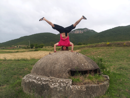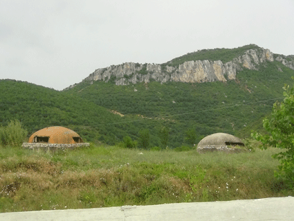 Wir fahren zügig über die Hochebenen, umrahmt von Bergen, schlechten Straßen, extrem arm aussehenden Dörfer, treffen immer wieder auf beladene Pferde oder Eselfuhrwerke ... Endlich kommen wir nach Korce und von da wird die Straße Richtung Ohrid See wieder besser. Der riesige See ist zur Hälfte albanisch zur Hälfte Mazedonisch. Die Straße am albanischen Südufer ist allerdings eine Katastrophe, komplette Baustelle und viel Verkehr. Wir finden trotzdem eine Stelle an einem Friedhof , wo man Picknick machen kann. An einem orange bemalten Bunker machen wir ein Fotoshooting.