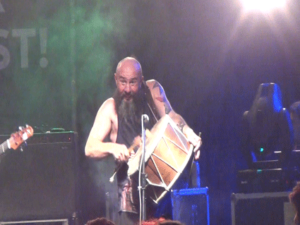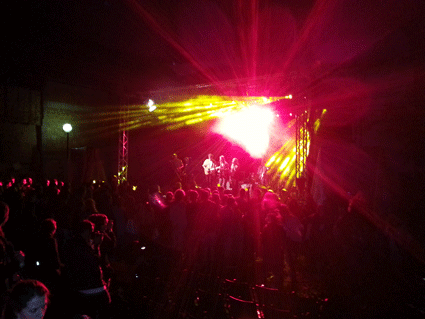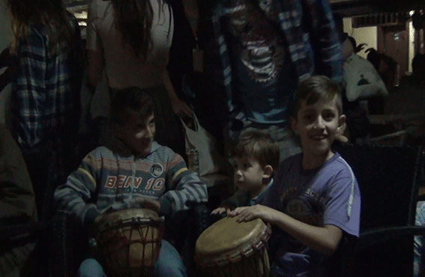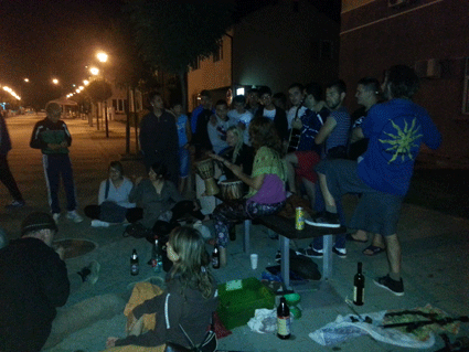 Gegen Abend packen wir die Feuersachen und eine Trommel ein und gehen auf die Konzerte der Stadt. Es regnet wieder in Strömen. Conni will zu Por-No und Cute Babulja, zwei Bands aus Prishtina. Das Konzert ist Open Air und hat noch nicht begonnen. Wir kommen nicht rein, brauchen Tickets vom NGOM Infostand auf der anderen Flussseite. Conni trifft zufällig Ronni, einen alten Bekannten und sehr guten Percussionisten aus Prishtina. Wir sitzen unter Schirmen in einem Straßencafe und spielen dort alle zusammen Musik. Stöpsel spielt Feuer und wird von einem Fernsehteam gefilmt. Orest spielt Flöte und einige Kinder wollen auch mit trommeln. Auch Adee aus Tirana taucht auf. Wir lernen viele Leute aus Prizren, Prishtina und Albanien kennen und gucken uns die Konzerte an, unter anderem auch Culture Shock, eine bosnisch-amerikanische Band, die oft schon in Frankfurt gespielt hat.