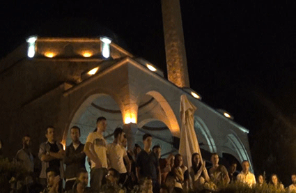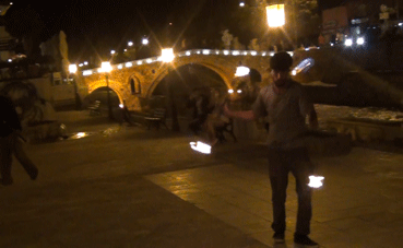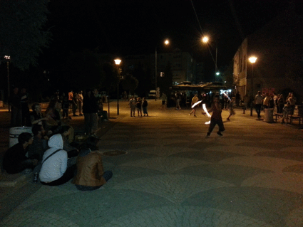Unsere Abschluss-Feuersession mit Live-Musik, E-Gitarre, Akustischer Gitarre, Trommel und Perkussion findet statt vor der Moschee direkt am Fluss. Zahreiche flanierende Menschen bleiben stehen und gucken zu. Ronni aus Prishtina spielt Trommel, Vincent aus Vlore und Conni E-Gitarren, Wula und ein Mädchen aus Prishtina Perkussion. Jan, Orest und Conni spielen Feuerstock und lassen später auch zuschauende Jugendliche mitspielen.