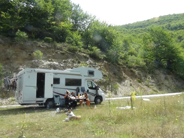 Abfahrt mittags in Prizren an die albanische Grenze. An der albanischen Grenze gibt es ein echtes Problem, weil wir nicht den orginal Camper-Fahrzeugschein, sondern nur die Kopie von Alice mit dabei haben. Nach einiger Diskutiererei dürfen wir einreisen und gelangen auf die neue Autobahn, die Prishtina und Tirana durch die Berge verbindet. Eine (klassische) Betriebsanleitung zur Autobahn scheint die albanische Bergbewohnerschaft aber nicht zu kennen. Wir treffen darauf auf Kühe, Hirte, Beschneidungsfest, Hochzeitsgesellschaft etc. ... Eine Panne mit dem Camperwassertank führt zu Hochwasser im Fahrzeug und Notstop an einer Tankstelle. Das Wasser muss wieder abgelassen werden. Nach der Bergautobahn kommen wir auf die Hauptstrasse von Skodra nach Dürres, wo der Verkehr stark zunimmt. Wir fahren Richtung Süden über Dürres (Hotels, Strandmeile, Verkehr, Baustellen ...) nach Vlore.