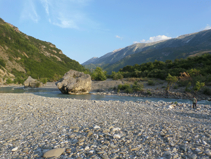 Nächster Stopp: Vjosa, ein Wildfluss, der bedroht ist. Die Vijosa soll mit Hilfe von westlichen Investoren und EU-Geldern aufgestaut werden. Der Fluss fließt entweder frei in einem breiten Kiesbett oder gräbt sich tief in das Tal und die Felsen ein. (Siehe Doku Musikfilm)
