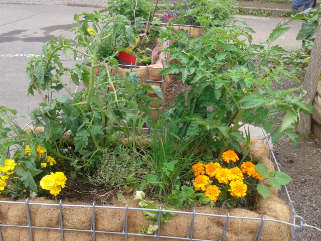 Im Mai haben alle 2. Klassen und die Umwelt AG jeweils zwei von den Behältern bepflanzt, die „Gabionen“ heißen. Das ist ein Drahtgestell, das mit Haken zusammengesteckt und mit einem Vlies aus Kokosfasern ausgelegt wird, damit die Erde drin bleibt. Selbst in die kleinen Gabionen – es gibt auch höhere – passt genug Erde rein, um ein paar Jahre essbare Pflanzen anzubauen.
