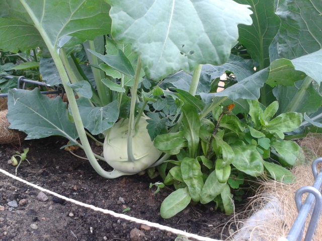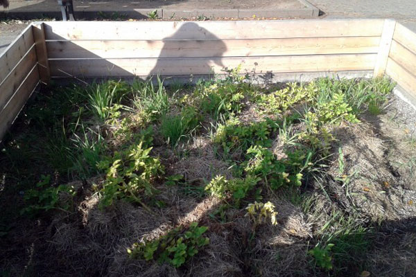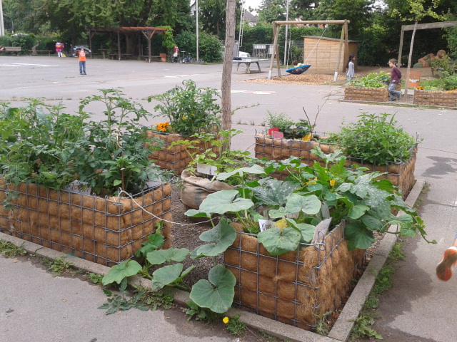 Es wachsen jetzt schon Erdbeeren, Tomaten, Kürbis, Zucchini, Gurken und verschiedene duftende Kräuter und essbare Blüten. Radieschen und Salat konnten vor den Sommerferien geerntet werden. In dem großen Beet kommen Kartoffeln aus dem Heu, sodass es im Herbst dann ein Mal selbstgepflanzte Kartoffeln in der Cafeteria geben wird.